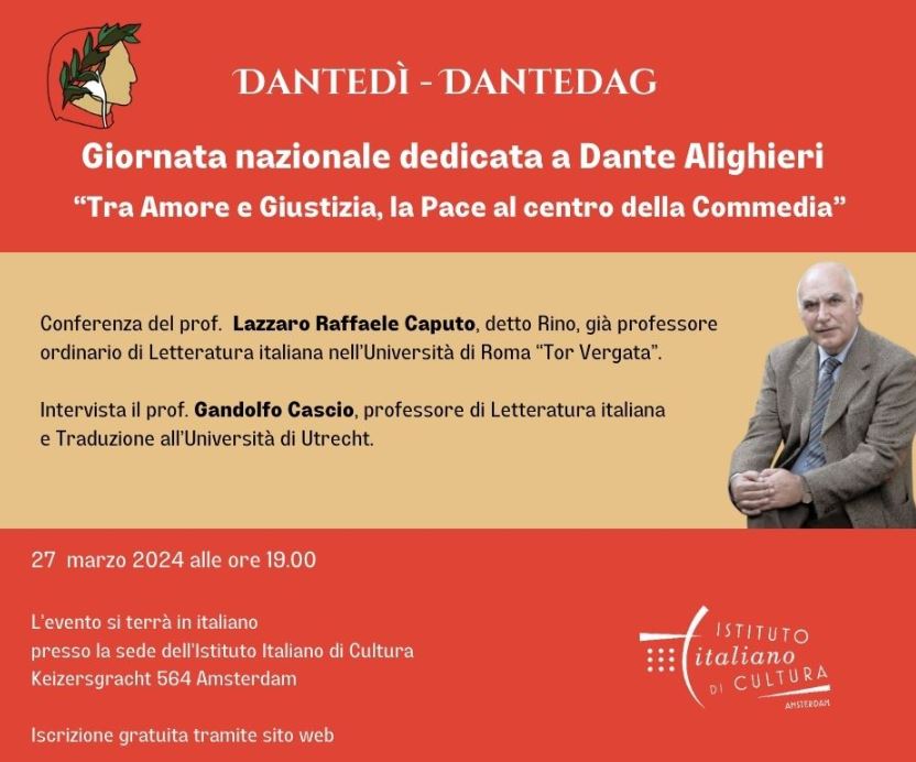AMSTERDAM\ aise\ - Si terrà mercoledì prossimo, 27 marzo, alle ore 19.30, l'evento organizzato dall'Istituto Italiano di Cultura di Amsterdam in occasione del Dantedì, la giornata dedicata a Dante Alighieri e alla sua opera maestra, dal titolo "Tra Amore e Giustizia, la Pace al centro della Commedia".