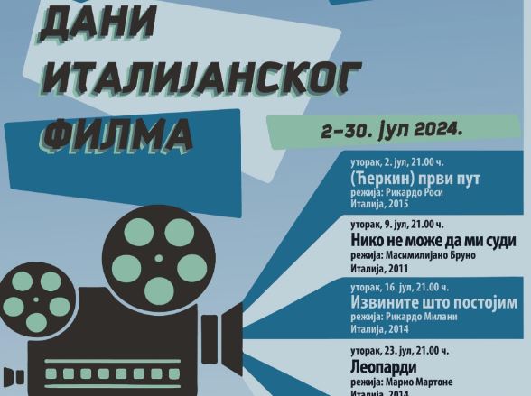 BELGRADO\ aise\ - Prenderanno il via domani, 2 luglio, e si chiuderanno alla fine del mese, 30 luglio, le Giornate del Cinema Italiano a Zaječar, in Serbia. L'evento, organizzato dall'Istituto Italiano di Cultura di Belgrado, si terrà in maniera gratuita al Museo del Teatro di Zaječar.
