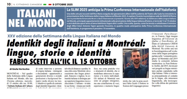 MONTRÉAL\ aise\ - “Nel quadro della Settimana della Lingua Italiana nel Mondo, alla sua 25esima edizione, mercoledì 15 ottobre alle ore 18:00, l’Istituto Italiano di Cultura di Montréal presenta la conferenza Identikit degli italiani a Montréal: lingue, storie e identità, tenuta dal Prof. Fabio Scetti. Chi sono gli italiani di Montréal oggi? Come parlano? E cosa significa, per loro, parlare italiano? Questo contributo nasce da una ricerca di sociolinguistica condotta a Montréal, che ha raccolto più di cento interviste a persone di origine italiana – immigrati e discendenti – appartenenti a generazioni diverse e avendo professioni e background formativi molto diversi tra loro”. Ne scrive Giulia Verticchio sul “Cittadino canadese”, settimanale diretto a Montreal da Vittorio Giordano.