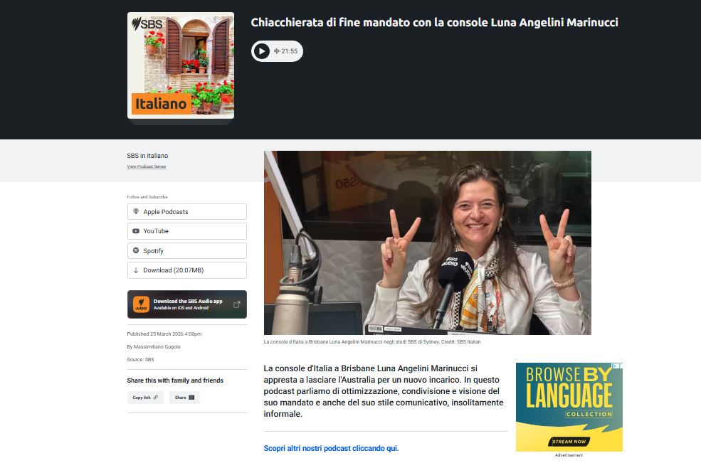 BRISBANE\ aise\ - “La console d'Italia a Brisbane Luna Angelini Marinucci si appresta a lasciare l'Australia per un nuovo incarico”. Massimiliano Gugole l’ha intervistata per Sbs Italian, lo Special Broadcasting Service che diffonde notizie in lingua italiana in tutta l’Australia. Nell’articolo e nel relativo podcast di approfondimento Gugole e Marinucci hanno parlato di “ottimizzazione, condivisione e visione del suo mandato e anche del suo stile comunicativo, insolitamente informale”.