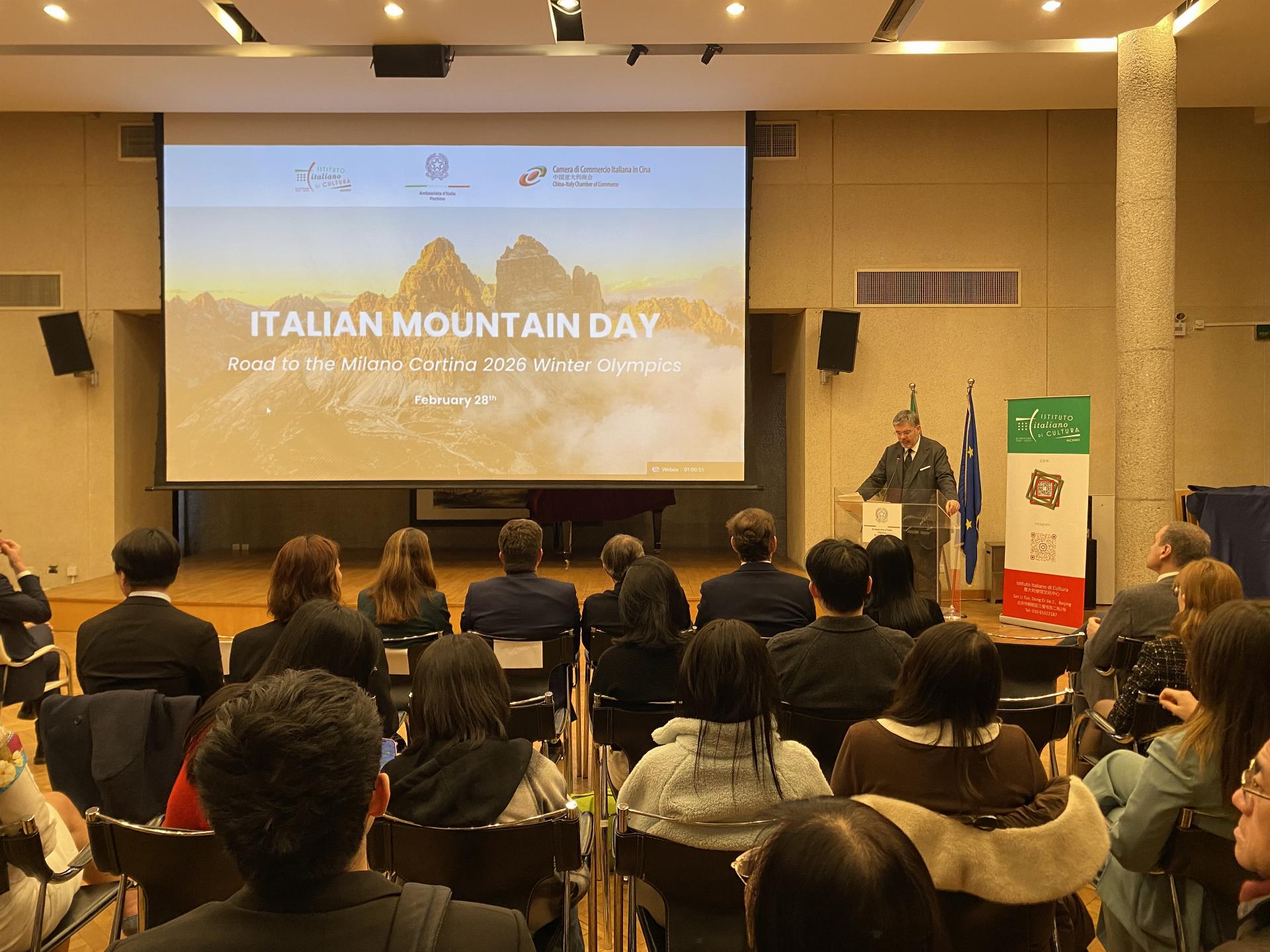 PECHINO\ aise\ - “Italian Mountain Day” è il titolo dell’evento che l’Ambasciata d’Italia a Pechino ha organizzato in collaborazione con l’Istituto Italiano di Cultura e la Camera di Commercio Italiana in Cina. L'incontro è stato dedicato alla valorizzazione del patrimonio montano italiano, con uno sguardo rivolto verso la promozione dei Giochi Olimpici e Paralimpici Invernali di Milano Cortina 2026.