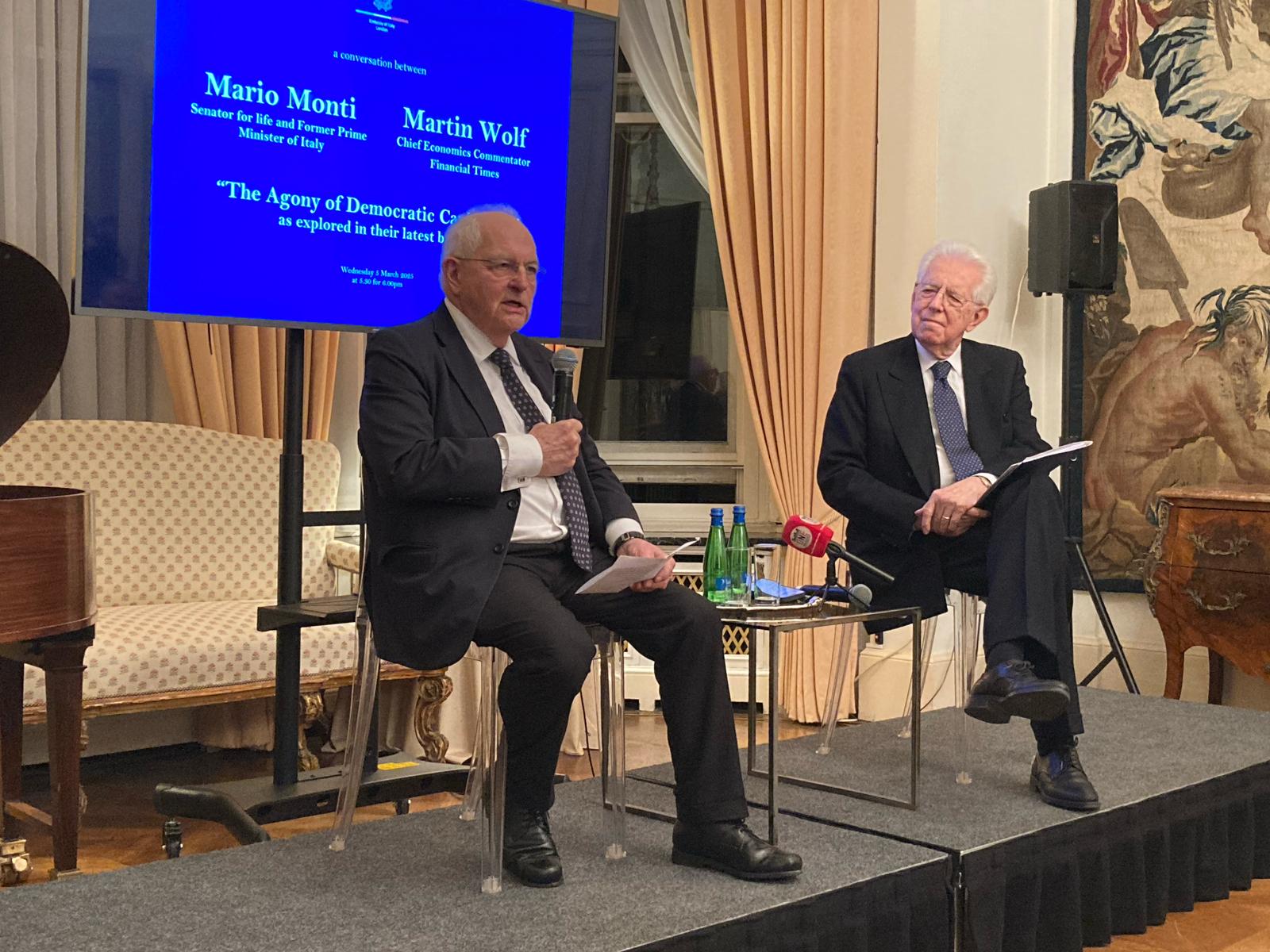 Mario Monti e Martin Wolf in conversazione all’Ambasciata d’Italia a Londra