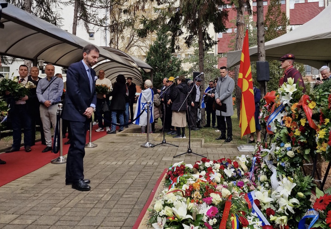 SKOPJE\ aise\ - In occasione del 82mo anniversario della tragica deportazione degli ebrei macedoni al campo di sterminio di Treblinka, avvenuta nella notte tra il 10 e l’11 marzo 1943, l’ambasciatore d’Italia a Skopje, Paolo Palminteri, ha partecipato alla cerimonia di deposizione di fiori davanti al monumento dedicato ai 7.144 ebrei macedoni deportati, organizzata dalla Comunità ebraica macedone in collaborazione con il Fondo dell’Olocausto degli ebrei macedoni.