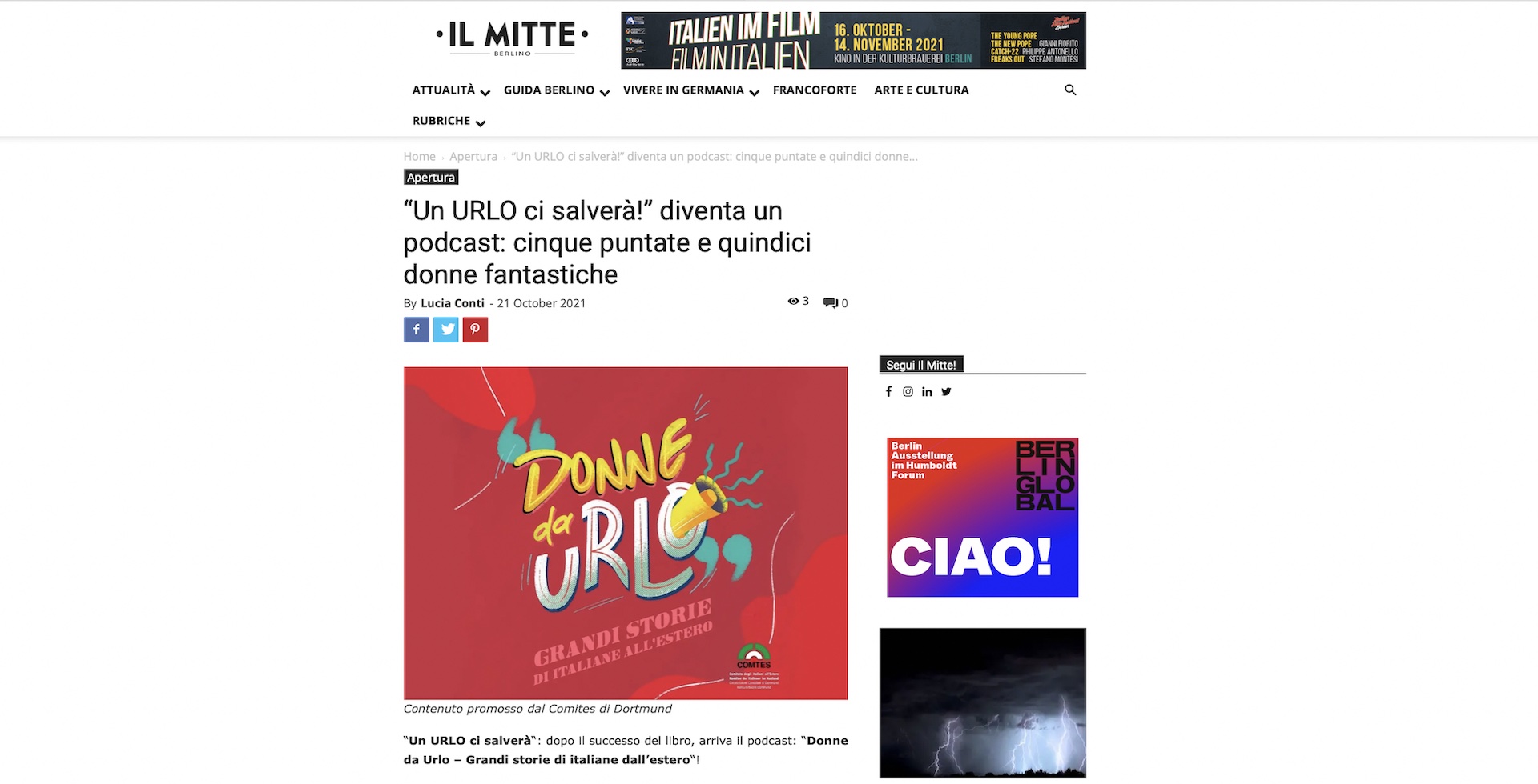 BERLINO\ aise\ - “Un URLO ci salverà“: dopo il successo del libro, arriva il podcast: “Donne da Urlo – Grandi storie di italiane dall’estero“! Ad annunciarlo è Lucia Conti dalle pagine del giornale on line da lei diretto, IlMitte.com.