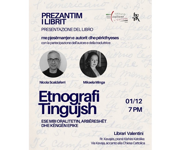 TIRANA\ aise\ - Si intitola “Ernografi tingujsh” il saggio di Nicola Scaldaferri che, tradotto da Mikaela Minga, verrà presentato domani, 1 dicembre, a Tirana. Promosso dall’Istituto ...