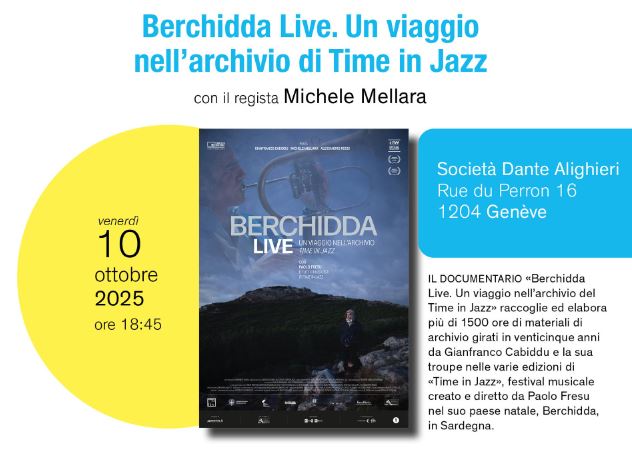 GINEVRA\ aise\ - Si terrà il prossimo venerdì 10 ottobre, alle ore 18.45, l'incontro organizzato dalla Società Dante Alighieri di Ginevra, in Svizzera, con cui presenterà il documentario di Michele Mallara “Berchidda Live. Un viaggio nell’archivio del Time in Jazz”.