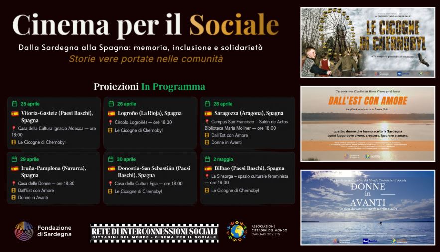 CAGLIARI\ aise\ - Tra il 25 aprile e il 2 maggio, la Rete di Interconnessioni Sociali, promossa da Cittadini del Mondo – Cinema per il Sociale, porterà in Spagna un articolato percorso di proiezioni e incontri. Nato in Sardegna, il progetto coinvolgerà quattro comunità autonome spagnole — Paesi Baschi, La Rioja, Aragona e Navarra — e toccherà le città di Vitoria-Gasteiz, Logroño, Saragozza, Pamplona, Donostia-San Sebastián e Bilbao.