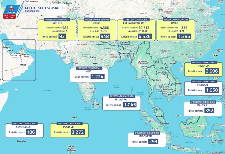 ROMA\ aise\ - Sono in partenza oggi, 5 marzo, ulteriori voli per gli italiani rimasti bloccati per via del conflitto in Medio Oriente divampato dagli attacchi di Stati Uniti e Israele contro l’Iran. Dai numeri che ha riportato la Farnesina in una nota, sono ancora 8.900 i turisti italiani nei paesi del Golfo: 92 in Bahrein, 948 in Qatar, 6.536 negli Emirati Arabi Uniti e 1.386 in Oman.